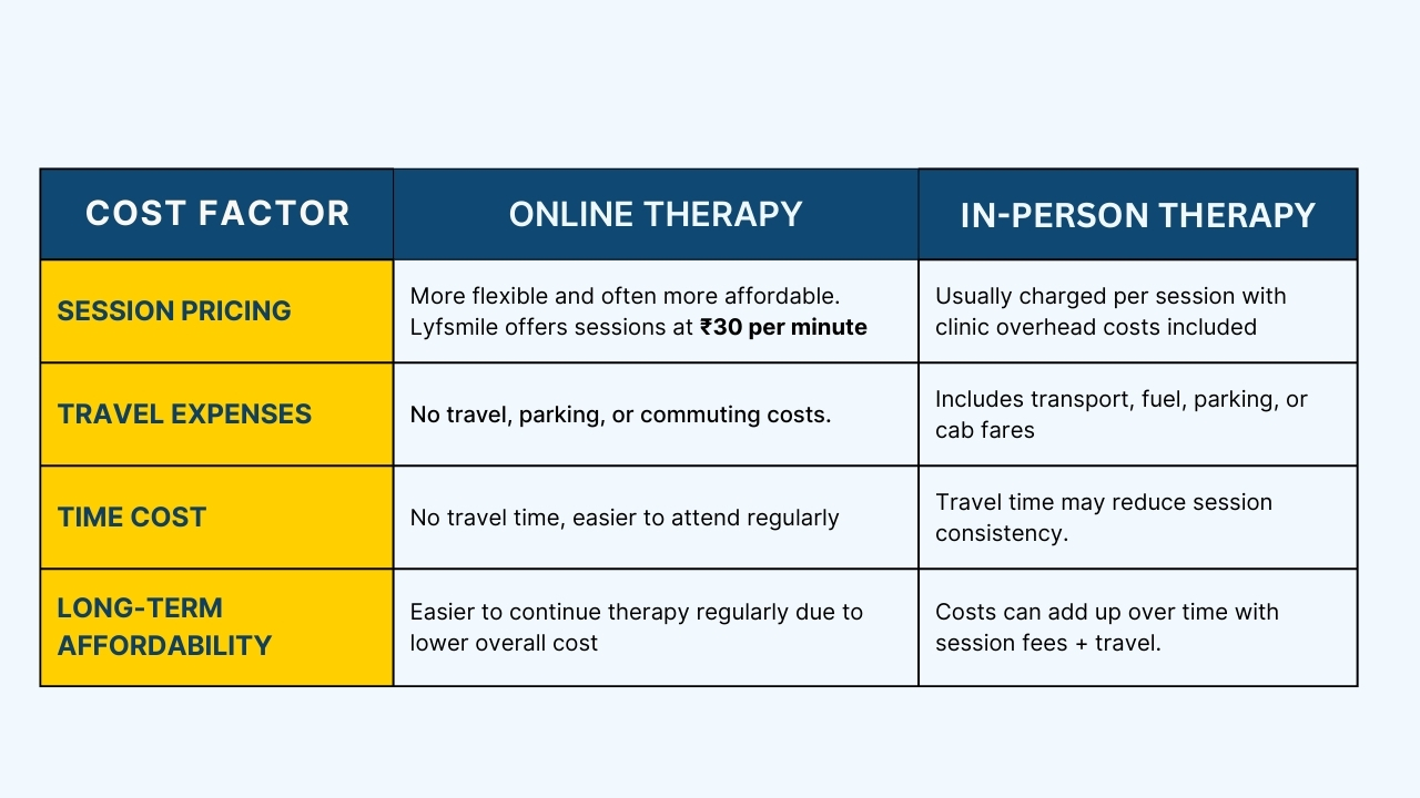 Both affordable online therapy and in-person therapy offer effective ways to receive emotional support, each with its own benefits. Online therapy is valued for its flexibility, convenience, and cost-effectiveness, making it easier to stay consistent for individuals in India and NRIs living abroad. Platforms like Lyfsmile offer accessible online therapy options that fit modern lifestyles.