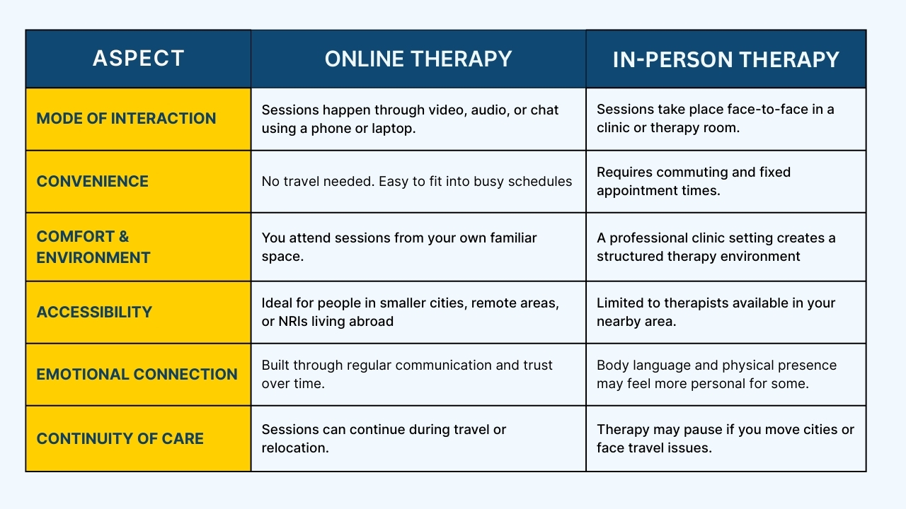 Both online and in-person sessions provide professional guidance, but the experience can feel different based on comfort, surroundings, and personal preference for individuals in India and NRIs seeking support from a familiar cultural background.
